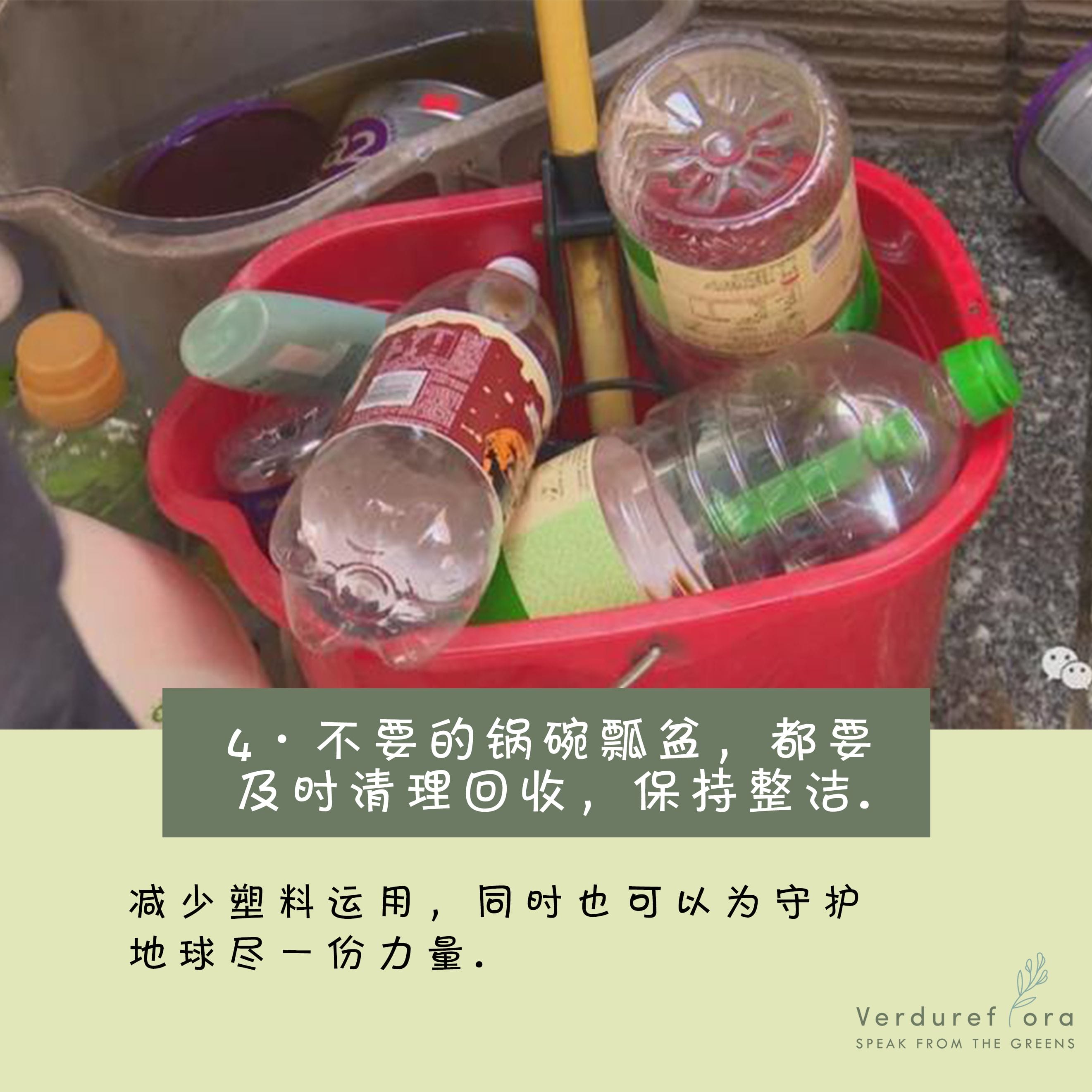 - 把用完的罐子及瓶子放進有蓋的垃圾箱內及時清理回收, 保持整潔。
